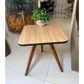 Mesa de canto, tampo em mdf 18mm laminado visual de madeira cumaru. O corte é feito a laser com alta precisão e acabamento impecável. Os 3 pés palitos são produzidos em madeira. Esta é uma linda peça para deixar seu ambiente mais elegante, organizado e aconchegante. Somente ambientes internos.