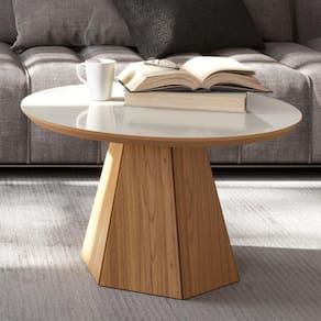 O estilo de decoração vem mudando com o tempo, mas um item que permanece como queridinho nesse cômodo é com certeza a mesa de centro, graças a sua praticidade para o dia a dia! E o modelo West na tonalidade off white/freijó combina o clássico e o moderno em um só item! Ela é fabricada 100% MDF com acabamento em pintura UV fosca garantindo qualidade e resistência, mas o diferencial mesmo é a base em formato hexagonal e o tampo redondo com borda chanfrada que suporta até 40Kg! Ah, e essa mesa de centro redonda ainda possui 6 sapatas plásticas!