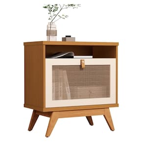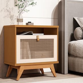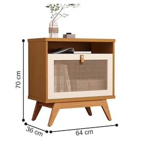 A estrutura é feita em MDP 15/25mm. Possui 1 porta em ratam com moldura de 15mm em MDF, 1 nicho e 4 pés em madeira maciça.