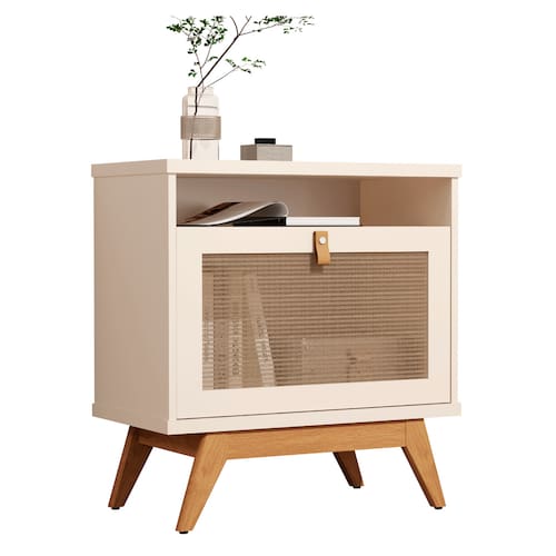 A estrutura é feita em MDP 15/25mm. Possui 1 porta em ratam com moldura de 15mm em MDF, 1 nicho e 4 pés em madeira maciça.