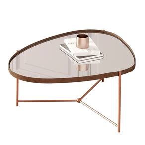 A mesa de centro orgânica alamanda contém a borda em couro sintético com 0,4 cm de altura, espelho e pés em ferro na cor bronze.