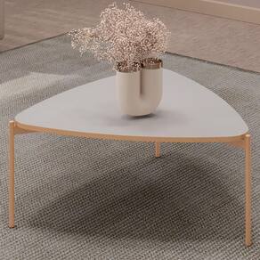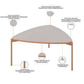 Essa mesa de centro possui tampo usinado com cantos arredondados, ou seja, suas linhas limpas e ângulos marcantes não apenas atraem o olhar, mas também otimizam o espaço, tornando-a ideal para sala de estar ou living de diversos tamanhos. Enquanto os pés metálicos garantem estabilidade e durabilidade, a superfície oferece espaço suficiente para exibir livros, revistas, objetos decorativos ou até mesmo um arranjo floral. Além disso, a forma triangular permite que você a posicione de diversas maneiras, facilitando a circulação e proporcionando um layout dinâmico.