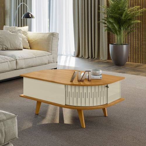 A Mesa de Centro Indianápolis é projetada para adicionar funcionalidade e estilo à sua sala de estar. Possui puxadores na cor bronze que harmonizam com as curvas do móvel, cujo formato lembra uma folha de árvore. Seu grande diferencial são as duas portas flexíveis em MDF que deslizam acompanhando a curvatura, permitindo armazenar objetos no interior.