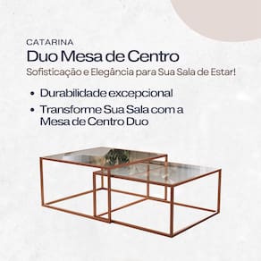 A Mesa De Centro Duo Catarina combina modernidade e praticidade em um design industrial atemporal. Com estrutura em aço carbono e tampo de vidro temperado, oferece resistência e leveza visual, sendo ideal para compor a decoração de salas de estar modernas. O conjunto de duas mesas de alturas diferentes permite o uso de forma combinada ou separada, trazendo versatilidade e funcionalidade ao ambiente. Compacta, elegante e funcional, é perfeita para apoiar objetos decorativos, bandejas ou itens de uso diário, complementando a decoração com estilo.
