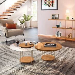 A Mesa de Centro Para Sala Pés Metálicos Kit 2 Mia Cinamomo é a escolha perfeita para quem deseja um ambiente moderno. Se você tem um estilo mais clássico, o nosso kit 2 mesas de centro pode ser um verdadeiro aliado na hora de decorar. Com um design contemporâneo, as mesas apresentam tampo de MDF de 25mm e em uma das versões bordas em vidro de 6mm, criando uma atmosfera acolhedora e sofisticada entre diferentes materiais. Os pés em aço maciço 3/8, com acabamento dourado, adicionam um toque de requinte, enquanto a leveza das formas e a versatilidade das mesas de centro redonda permite máxima funcionalidade com diversas possibilidades de decoração. Ambas contam com uma prateleira inferior, um espaço adicional para revistas e objetos decorativos. Quando utilizadas ??em conjunto, elas propõem uma solução funcional e elegante para compor qualquer ambiente com sofisticação. Transforme sua casa em um verdadeiro refúgio de bem-estar. Garanta já seu kit 2 mesas de centro Mia!