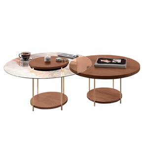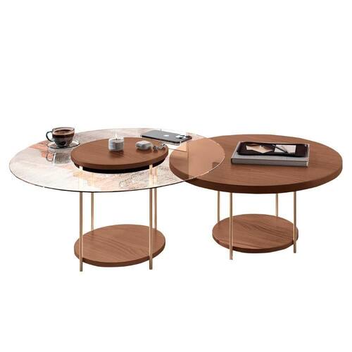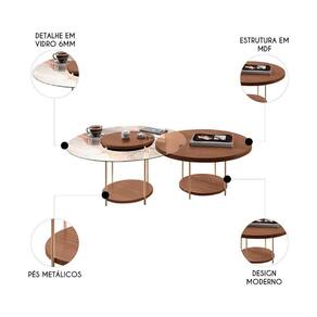 Com um design contemporâneo, as mesas apresentam tampo de MDF de 25mm e em uma das versões bordas em vidro de 6mm, criando uma composição harmoniosa entre diferentes materiais. Os pés em aço maciço 3/8, com acabamento dourado, adicionam um toque de elegância, enquanto a leveza das formas e a versatilidade da Mesa de Centro redonda permite diversas possibilidades de decoração. Ambas possuem uma prateleira inferior, um espaço extra para revistar e objetos decorativos. Ao serem usadas em conjunto, elas oferecem uma solução prática e estilosa para compor ambientes modernos e sofisticados.