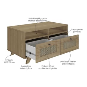 - Organização inteligente: Duas gavetas para guardar objetos sempre à mão e manter sua sala impecável, trazendo praticidade ao seu dia a dia. - Detalhes em impressão palha: Acabamento refinado no estilo boho chic que adiciona um toque de sofisticação à mesa, elevando o visual do seu espaço. - Nichos versáteis: Espaço adicional para objetos decorativos ou itens essenciais, agregando mais utilidade ao móvel. - Amplo tampo: Perfeito para dar destaque às mais belas decorações no centro de sua sala. - Pés estáveis em MDF: Pés sólidos em MDF de 25mm proporcionam mais estabilidade e resistência. A beleza aliada à praticidade que seu espaço merece!