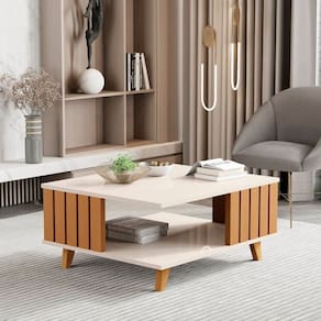 A mesa de centro ripada exclusiva da linha açaí tem tampo e base em 15mm, laterais ripadas em MDF de 1,2cm além dos pés em madeira maciça com design único e sofisticado.