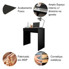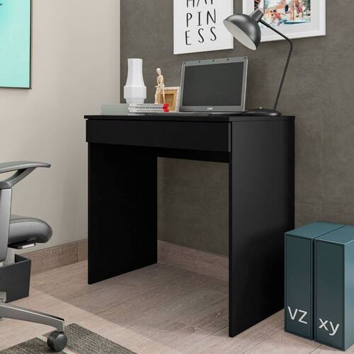 Todo mundo precisa de um espaço para estudar ou trabalhar, e como essas atividades são super importantes e exigem total concentração, é preciso ter um cantinho especial para isso. Com a Mesa para Computador Alana você poderá realizar suas atividades com toda a comodidade e organização, já que ela conta com tampo espaçoso para apoiar eletrônicos, como o notebook e também outros itens essenciais, como materiais de papelaria, uma luminária, fones e carregadores, etc. Essa mesa para escritório possui muitos diferenciais: 01 gaveta com divisão para melhor organizar seus pertences, corrediças metálicas de ótima qualidade, fabricada com estrutura em MDP e com um excelente acabamento em pintura UV brilho ou fosco para maior durabilidade do móvel.Garanta já a sua Mesa de Escritório Alana e ouse na sua utilização deixando seu ambiente ainda mais lindo! Dimensões: Altura: 77 cmLargura: 80 cmProfundidade: 45 cmPeso: 15 KgPeso Suportado: 10 Kg Especificações Técnicas: Estrutura: MDP.Material do Fundo: Madefibra.Acabamento: Brilho ou Fosco.Quantidade de gaveta: 1.Tipo de Corrediças: Metálicas.Sistema de montagem: Minifix/Cavilhas/Pregos/Parafusos.Manual de montagem: Sim.Montagem: Recomendamos que seja feita por um profissional.Garantia: 3 meses contra defeito de fabricação.Instruções de Limpeza: Utilizar um pano limpo levemente úmido e detergente neutro.Você irá receber: 01 volume. Observações Relevantes: - Produto para uso residencial em ambiente interno, não devendo ficar exposto diretamente ao sol, calor e umidades excessivas.- As imagens são meramente ilustrativas, não acompanham objetos de decoração e eletros.