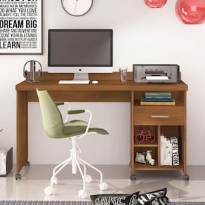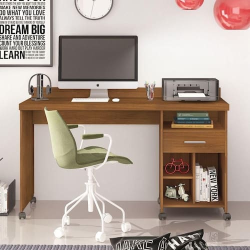 Possui uma gaveta com corrediças telescópicas e rodizios.
