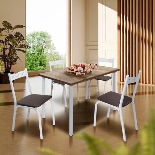 Este conjunto inclui uma mesa e quatro cadeiras, todos com estrutura e pés em aço carbono High-Steel, garantindo resistência e proteção contra ferrugem. As cadeiras possuem assentos de madeira com revestimento em corino sintético e sapatas nos pés para proteger tanto o produto quanto o piso de riscos, suportando até 100 kg cada. A mesa apresenta tampo em MDP BP, ideal para refeições em família ou encontros sociais.