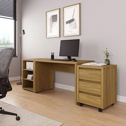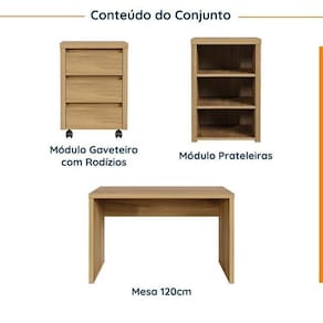 Com um design minimalista e elegante, o Conjunto Home Office Ficus foi projetada para permitir que você crie diferentes configurações para atender às suas necessidades de espaço e organização combinando este móvel com outros da linha Ficus. Seja para um escritório em casa ou para uma empresa, esta peça irá adicionar um toque de sofisticação e funcionalidade ao seu ambiente de trabalho. Esta linha foi desenvolvida com uma técnica especial que consiste em unir várias camadas de MDF de alta qualidade, formando um painel leve porém resistente e com aparência robusta de 37mm de espessura, conhecido como tamburato. O acabamento das chapas é em BP com fitas de borda em PVC que conferem ainda mais durabilidade e resistência à umidade para o móvel. Possui também sapatas niveladoras que possibilitam o correto ajuste do móvel em qualquer piso. Acabamento: BP Altura do Conjunto: 74 cm Ambiente: null Ambiente Principal: Escritório Cor: Rovere Informação Complementar: 1x Mesa de Escritório em Tamburato Acabamento em BP 120cm Ficus Rovere Largura: 120 cm Altura: 74,1 cm Peso: 28,33 kg Profundidade: 59,8 cm Necessita Montagem: Sim