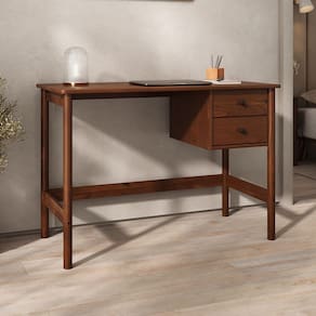 A Escrivaninha Para Home Office De Madeira Maciça Marlo é a peça que transforma qualquer quarto ou escritório em um ambiente mais organizado, bonito e funcional. Com duas gavetas amplas, laterais em MDP preto e corrediças telescópicas, ela guarda seus itens de forma prática, mantendo a superfície sempre livre para trabalhar, estudar ou se arrumar.