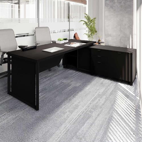 Mesa Executiva 2,00m F5 Office com armário lateral e caixa de tomadas. Combina design moderno, elegância e funcionalidade para ambientes corporativos e home offices.