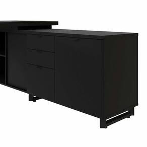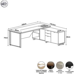 Altura: 66 cm Acabamento do Tampo: BP Melamínico Acabamento dos Pés: Pintura Acompanha Manual de Instalação: Sim Ambiente Principal: Escritório codigo_ean: 7900288252029 Complexidade da Montagem: Média: pode ser montado por mais de uma pessoa e/ou necessite de maior conhecimento para montagem Cor: Preto Cor da Base: Preto Cor do Produto: Preto Cor do Tampo: Preto Cor Flex: Não Cor Interna: Preto Escala de Brilho: Fosco Espessura do Tampo: 40 mm Formato: Em L Gaveta com Chave: Não Itens Inclusos: 1 Escrivaninha, 1 Armário Lateral, Kit Ferragens e Manual da Montagem. Lado de Montagem: Direito Largura do Segundo Lado: 176,5 cm Linha ou Coleção: Corporate Manual de Montagem e Instalação: https://cdn2.madeiramadeira.com.br/atributo/casa-lar-shop-ltda/3260869-6595-17597482847955.pdf Marca: F5 Office Material da Estrutura: MDP/Metal Material do Puxador da Gaveta: Metal Material do Puxador da Porta: Metal Material do Tampo: MDP Material dos Pés: Metal Material Principal: MDP Montagem Flex: Não, o produto só pode ser montado conforme a imagem. Necessita Montagem: Sim Origem do Produto: Nacional Pés com Regulagem de Altura: Sim Pés Reguláveis: Sim Peso: 140,85 kg Peso Máximo por Gaveta: 15 kg Peso Máximo por Prateleira: 10 kg Posição da Gaveta: Lateral Possui Acabamento na Parte de Trás: Sim Possui Borda Arredondada: Sim Possui Caixa de Tomada: Sim Possui Gaveta para Pasta Suspensa: Sim Possui Passa Cabos: 01 Possui Porta Objetos: Sim Possui Portas: 01 Possui Prateleiras: Sim Quantidade de Gavetas: 03 Gavetas Quantidade de Nichos: 02 Quantidade de Prateleiras: 02 Prateleiras Recomendações de Uso, Manutenção e Limpeza: Para uma limpeza mais efetiva, utilizar apenas pano macio e sabão neutro. Não utilizar produtos abrasivos. Sapatas Niveladoras: Sim Sistema de Montagem: Parafusos e buchas metálicas. Suporta Até (kg): 80 kg Tipo de Corrediça da Gaveta: Metálica Telescópica Tipo de Dobradiça/Corrediça da Porta: Metálica Marca: Não Informado