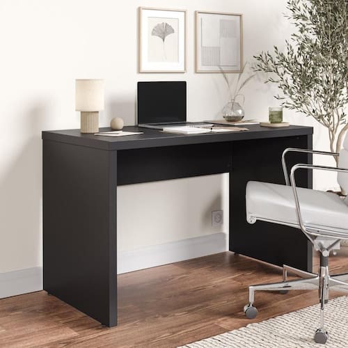 Mesa de Escritório em Tamburato Acabamento em Bp 120cm Ficus CabeCasa MadeiraMadeira Preto. Com um design minimalista e elegante, a Escrivaninha Reta Modular Ficus foi projetada para permitir que você crie diferentes configurações para atender às suas necessidades de espaço e organização combinando este móvel com outros da linha Ficus. Seja para um escritório em casa ou para uma empresa, esta peça irá adicionar um toque de sofisticação e funcionalidade ao seu ambiente de trabalho. Esta linha foi desenvolvida com uma técnica especial que consiste em unir várias camadas de MDF de alta qualidade, formando um painel leve porém resistente e com aparência robusta de 37mm de espessura, conhecido como tamburato. O acabamento das chapas é em BP com fitas de borda em PVC que conferem ainda mais durabilidade e resistência à umidade para o móvel. Possui também sapatas niveladoras que possibilitam o correto ajuste do móvel em qualquer piso.