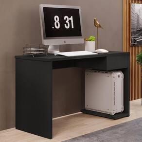 A Mesa De Escritório é feita toda em MDP que é um material resistente e durável, possui um tampo amplo oferece espaço suficiente para acomodar o seu monitor, teclado, mouse e outros acessórios. A Escrivaninha conta também com uma gaveta com corrediça metálica, que facilita a organização dos seus documentos e objetos pessoais. Além disso a Mesa Para já vem com base para CPU, na parte interna do lado direito da mesa. Ela tem um design moderno e funcional e combina com qualquer ambiente de trabalho ou estudo.