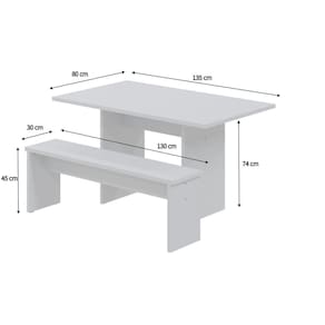 de 2,5cm, com bordas em PVC de 1cm, garantindo durabilidade e um excelente acabamento. Com um design minimalista e pés robustos, o conjunto oferece estabilidade e se adapta a diferentes estilos de decoração. Ideal para salas de jantar ou áreas de convivência, o Conjunto Essence é a escolha perfeita para quem busca qualidade e funcionalidade. Acabamento: BP Acabamento da Base: Melamínico Acabamento do Tampo: BP Ambiente Principal: Sala de Jantar Complexidade da Montagem: Alta: deve ser montado por um montador especializado Cor: Branco Cor do Produto: Branco Design da Base: Pedestal Duplo Dobrável: Não Escala de Brilho: Fosco Espessura do Tampo: 25 mm Extensível: Não Itens Inclusos: 1 Mesa de Jantar + 1 Banco Manual de Montagem e Instalação: https://cdn2.madeiramadeira.com.br/prd/compace-dalex/2674851-1738956921-977406-149063.pdf Marca: Metalig Material da Base: MDP Material do Tampo: MDP Medida da Base (A x L x P): 71,5 x 135 x 80 Medida da Mesa (A x L x P): 74 x 135 x 80 Medida do Tampo (L x C x E): 135cm x 80cm x 2,5cm Necessita Montagem: Sim Origem do Produto: Nacional Peso: 34,58 kg Possui Portas: Não Possui prateleira: Não Possui Rodízio: Não Possui Suporte Giratório: Não Possui Vidro: Não Recomendações de Uso, Manutenção e Limpeza: Para a limpeza, utilize flanela seca ou pano macio levemente umedecido em água. Utilize um pano seco em seguida. Evite contato com produtos químicos (solventes, thinner, acetona, etc) e não utilize nenhum tipo de esponja de aço. Resistência à Chuva: Não Resistência ao Sol: Não Sistema de Montagem: Parafuso, Sapata Niveladora, Bucha C/Rosca e Chave Hexagonal Suporta Até (kg): 330 kg Marca: Metalig