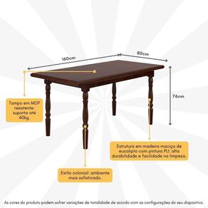 Aproveite momentos especiais à mesa com a Mesa de Jantar 160cm Multimóveis CR20278. Sua estrutura em madeira maciça de eucalipto garante durabilidade e resistência, enquanto o tampo em MDP suporta até 40kg e oferece espaço para até 6 lugares. Possui acabamento em pintura PU, que oferece facilidade na limpeza do móvel, tornando-a uma opção prática para o dia a dia. O estilo colonial agrega charme e elegância, tornando o ambiente mais acolhedor e convidativo.