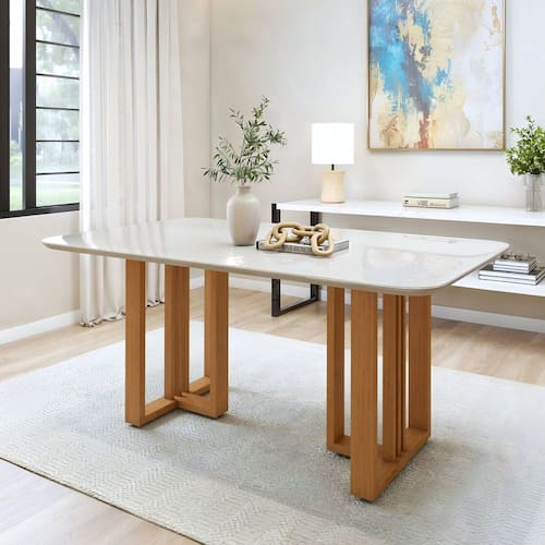 (Mesa avulsa, não acompanha cadeiras.) Sabe aquela Mesa de Jantar que faz você se apaixonar à 1ª vista? É essa! A mesa com tampo de vidro é fácil de limpar e perfeita para o dia a dia. A base em madeira maciça com design moderno dá um toque sofisticado e diferente de tudo que você já viu, trazendo firmeza e estilo para sua sala de jantar, deixando o ambiente sofisticado e acolhedor. Imagine receber amigos e família aqui, criando memórias ao redor de um móvel que impressiona em cada detalhe. Se você quer uma mesa moderna, resistente e que transforme sua casa, ela é a escolha dos seus sonhos!