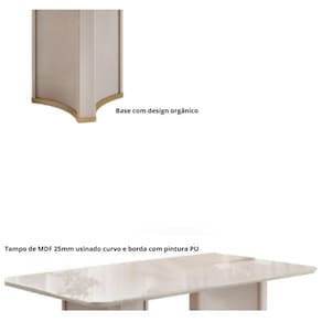 Caracter?sticas: Base com design org?nico Estrutura MDP e MDF Formato da mesa Org?nico Layout ideal para 8 lugares Moldura com borda soft Peso m?ximo que suporta 15Kg -tampo- Possui vidro com espessura de 4mm Possui sapatas deslizadoras Revestimento externo Impress?o Ultravioleta com 8 camadas Alto brilho e Texturizado Fosco Tampo de MDF 25mm usinado org?nico e borda com pintura PU