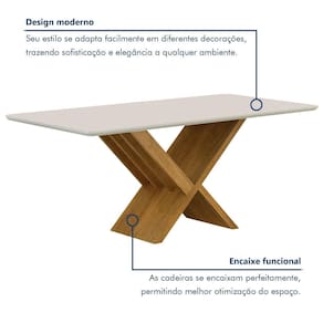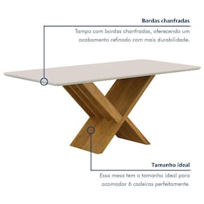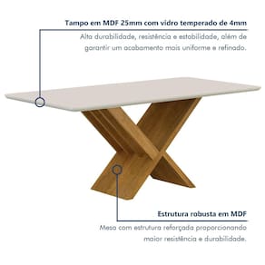 A mesa tem acabamento de alta qualidade, garantindo garantia e sofisticação. Acabamento: Pintura UV Acabamento do Tampo: Pintura Ambiente Principal: Sala de Jantar codigo_ean: 7900288070012 Complexidade da Montagem: Média: pode ser montado por mais de uma pessoa e/ou necessite de maior conhecimento para montagem Cor: Cinamomo/Off White Cor do Produto: Cinamomo/Off White Escala de Brilho: Fosco Espessura do Tampo: 29 mm Extensível: Não Itens Inclusos: 1 Mesa de Jantar + Manual de Instrução. Manual de Montagem e Instalação: https://cdn2.madeiramadeira.com.br/prd/valdemoveis/2685171-1739472138-978155-149202.pdf Marca: Valdemóveis Material da Base: MDP Material do Tampo: MDF Material Principal: MDF/MDP Medida do Tampo (L x C x E): 180cmx90cmx29mm Necessita Montagem: Sim Origem do Produto: Nacional Peso: 72 kg Possui Rodízio: Não Possui Vidro: Sim Recomendações de Uso, Manutenção e Limpeza: Recomendamos que a limpeza seja feita apenas com pano umedecido. Sistema de Montagem: Parafusos. Suporta Até (kg): 40 kg