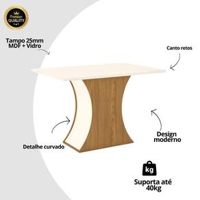 Com tampo de 120cm em MDF e vidro na cor Nature/Off White, ela acomoda até 4 pessoas com conforto e estilo, ideal para apartamentos ou salas de jantar menores.
