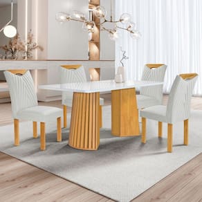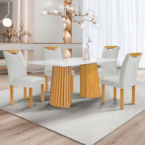 O(a) Mesa de Jantar 4 Lugares Stella com Vidro Ripado Cinamomo/Off White/Boucle Gelo - Cel Móveis é produzido em MDF na escala de brilho Fosco, e possui um grau de dificuldade de montagem: Médio.