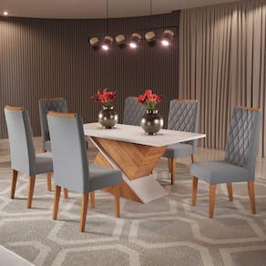 O(a) Mesa de Jantar 6 Lugares Poliana Blonde/Veludo Cinza - Viero Móveis é produzido em MDF e MDP na escala de brilho Semi-Brilho, e possui um grau de dificuldade de montagem: Médio.