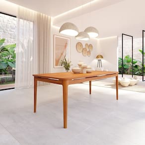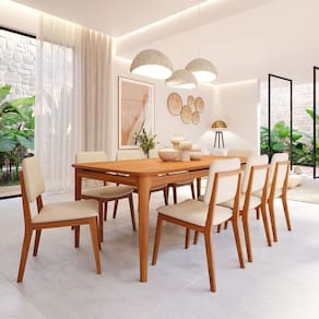 A linha Miriti é uma combinação de elegância e resistência, projetada para ambientes que buscam sofisticação e funcionalidade. O nome Miriti faz referência à palmeira amazônica, conhecida por sua versatilidade e força, características que se refletem nos materiais e no design da linha. As mesas são produzidas em madeira tauari maciça, com tampo de MDF de alta qualidade e pintura UV com padrão amadeirado, garantindo durabilidade e um visual natural. As cadeiras seguem o mesmo padrão de excelência, com estrutura também em tauari maciço, além de assento e encosto estofados em espuma D28, que combina firmeza e conforto. A espuma D28, com densidade de 28, oferece suporte moderado e durabilidade superior, preservando sua forma mesmo com o uso diário, o que proporciona uma experiência de conforto prolongada. O revestimento em tecido tipo linho acrescenta elegância e um toque suave ao conjunto.