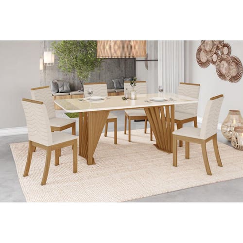 Mesa de Jantar 06 Lugares Adriana 2.000mm Tampo retangular em MDF 25 mm com sobreposição de vidro 4 mm, que garante mais resistência e durabilidade à peça. Tampo canto arredondado com vidro. Cadeira Isa: Densidade da espuma do Assento: D18. Densidade da espuma do Encosto: D15. Medidas; Mesa: A: 800 x L: 2000 x P: 900 mm Cadeira: A: 955 x L: 415 x P: 555 mm Grantia: 90 dias. Recomendação de limpeza: Usa pano levemente umedecido com água, seguido por pano seco. Evitar exposição ao sol, para aumentar a durabilidade da cor do tecido. Não usar escova e/ou produtos abrasivos. Montagem: Montagem, desmontagem e outras instalações serão de responsabilidade do cliente. Não nos responsabilizamos, no ato da entrega, por subir escadas/elevadores ou pelo transporte por guincho em apartamentos. Eventuais despesas são de responsabilidade do comprador; Observações importantes: A tonalidade da cor do produto pode variar de acordo com a sua tela, a iluminação do ambiente ou sua percepção visual Lembrando que são fotos ilustrativas tratadas em estúdios podendo haver pequena diferença nas cores A montagem será de responsabilidade do comprador; Não nos responsabilizamos, no ato da entrega, por subir escadas/elevadores ou transporte por guincho em apartamentos. Eventuais despesas são de responsabilidade do comprador; Confira as dimensões deste produto e certifique-se de que passará normalmente por supostos elevadores, portas, escadas e/ou corredores de sua residência; Para mais informações, acesse nossa Central de Atendimento. Marca: LM DECOR