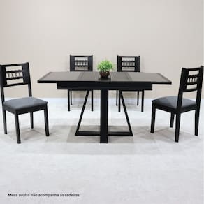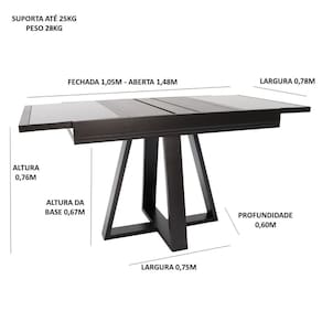 Com seu sistema de Mesa Elástica, a Mesa Afrodite possui simplicidade e elegância sem igual. Produzida 100% em madeira maciça e com seu tampo em vidro colado, 4mm e bordas de madeira com detalhe. Fechada 1,05m e aberta chegando a 1,48m. Acabamento: Verniz Acabamento da Base: Verniz Acabamento do Tampo: Verniz Ambiente Principal: Sala de Jantar Atóxico: Não codigo_ean: 7909903513279 Complexidade da Montagem: Média: pode ser montado por mais de uma pessoa e/ou necessite de maior conhecimento para montagem Cor: Preto Cor do Produto: Preto Dobrável: Não Escala de Brilho: Semi-Fosco Espessura do Tampo: 4 mm Extensível: Sim Itens Inclusos: 1 Tampo Montado, 1 Base Montada, Kit Ferragens e Manual de Montagem Largura Extendida: 105 cm Largura Quando Extendida: 148.0000 Manual de Montagem e Instalação: https://product-hub-prd.madeiramadeira.com.br/883209/documents/115c7f35-0abb-4795-91ff-dcfb15139d94ntagemmesadejantarafrodite.pdf Material da Base: Madeira Maciça Material do Tampo: Vidro Material Principal: Madeira Maciça Medida da Base (A x L x P): 0,67 x 0,75 x 0,60 Medida da Mesa (A x L x P): 0,76 x 1,05/1,48 x 0,78 Medida do Tampo (L x C x E): 0,78 x 1,05/1,48 x 0,10 Necessita Montagem: Sim Origem do Produto: Nacional Peso: 28 kg Possui Portas: Não Possui prateleira: Não Possui Rodízio: Não Possui Suporte Giratório: Não Possui Vidro: Sim Recomendações de Uso, Manutenção e Limpeza: Limpeza, apenas com pano úmido Sistema de Montagem: 8 Parafuso 4,0x30, e 2 Cavilha Ø8x20 Suporta Até (kg): 30 kg Tipo de Madeira Maciça: Pinus Tipo de Madeira Maciça da Base: Pinus