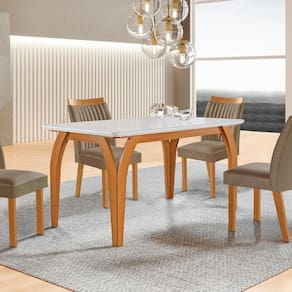Seu tampo retangular com acabamento em pintura UV garante beleza e fácil limpeza, enquanto os pés em madeira curvados oferecem um toque sofisticado ao ambiente.