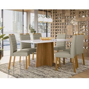 Esta montando sua sala de jantar ou cozinha? Nós temos a opção certa para que seu ambiente fique ainda mais bonito com toque refinado e mais funcional para o dia a dia.Apresentamos a mesa da linha Anitta e as cadeiras da linha Mariana. Um design moderno e sofisticado. Ideal para espaços maiores, acomoda confortavelmente até 6 pessoas. A mesa é desenvolvida em MDF, seu tampo possui aplicação de vidro adicionando elegância. As cadeiras são resistentes produzidas em madeira e macias, possuem espuma D 18 e revestimento com tecido de excelente qualidade com detalhes bordados. Não perca mais tempo a hora é agora deixe seu ambiente acolher e inovado venha adquirir já o seu!