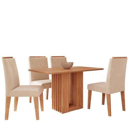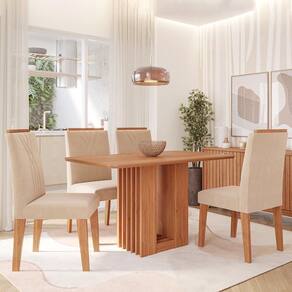 Mesa de Jantar Ariela 130x80 com Tampo em MDF e 4 Cadeiras Nicole - Cimol Móveis Com design elegante e acabamento refinado, o conjunto Ariela é ideal para transformar sua sala de jantar. A mesa possui estrutura em MDF, pintura UV, tampo de 25mm com cantos arredondados, bordas chanfradas e acabamento em laca, além de base com detalhe ripado e fixação oculta, que garante um visual limpo e moderno. Acompanha 4 cadeiras Nicole com estrutura em MDF, revestimento em tecido, espuma de alta densidade e encosto com detalhes bordados, unindo conforto, estilo e resistência para o dia a dia.