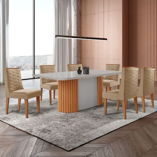 O conjunto combina design moderno, sofisticacao e funcionalidade. A Mesa Aspen se destaca pelo visual imponente, com tampo em MDF e vidro com canto copo, alem da base ripada que confere textura e personalidade ao ambiente. Ideal para quem busca um estilo clean e contemporaneo, ela transforma qualquer espaco com leveza e elegancia.