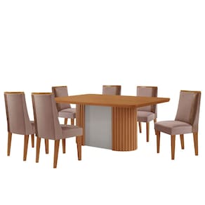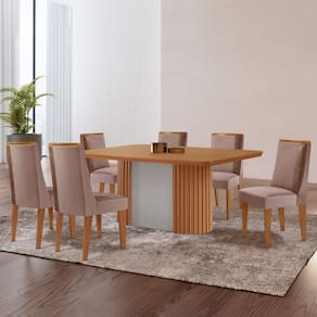 O Conjunto une design moderno, sofisticação e conforto em cada detalhe. A Mesa Aspen se destaca pelo tampo em MDF com canto copo e pela base ripada em MDF, que adiciona textura e personalidade ao ambiente. Ideal para quem busca um visual clean e atual, ela transforma qualquer espaço com leveza e elegância.