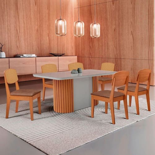 Mesa De Jantar Aspen 180cm Tampo Mdf Vidro Copper Premium Tork /nat/off/serig. Off Conjunto Mesa Aspen e Cadeira Copper Premium A Mesa Aspen traz um design moderno e imponente, com tampo em MDF e Vidro canto copo. Sua base ripada em MDF e o grande destaque da peca, trazendo uma textura cheia de personalidade. A Mesa Aspen transforma qualquer ambiente com sua presenca unica e atual o modelo perfeito para quem busca um design clean e sofisticado, trazendo leveza ao seu ambiente.