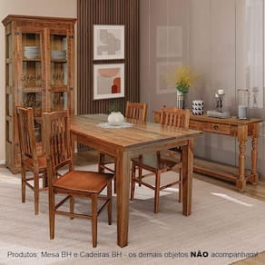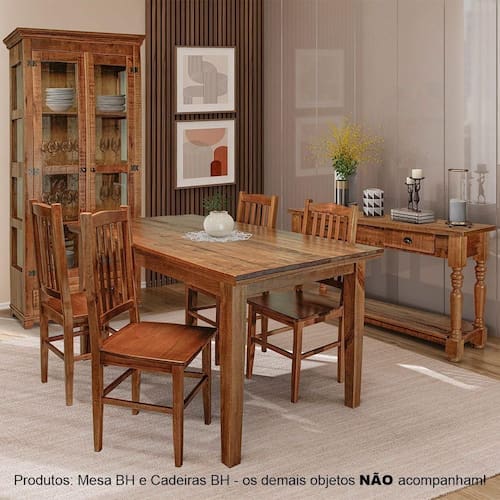 Conjunto de mesa BH com cadeiras BH em madeira maciça, unindo charme rústico, durabilidade e conforto. Perfeito para criar um ambiente sofisticado e acolhedor em qualquer espaço.