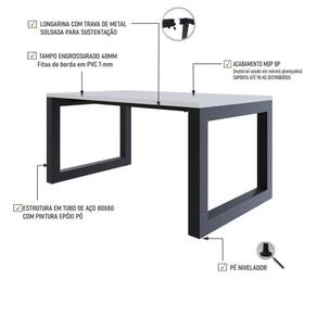 Os tampos engrossurados em MDP BP recobertos com fitas de borda em PVC de 01mm, garantem resistência e durabilidade com um acabamento refinado. As estruturas em aço com soldas a laser e suavizadas, possuem acabamento em pintura epóxi que confere solidez e um visual moderno, garantindo a longevidade e a robustez das peças.