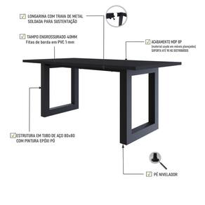 Sobre o ProdutoMesa de Jantar Bronx R 180x90x77cm BRMJ9180R çoDescrição do Produto:A mesa de jantar Bronx BRMJ9180R é a expressão perfeita da fusão entre elegância e robustez, ideal para ambientes modernos e contemporâneos. Com dimensões de 1,80x0,90m, esta peça impressiona pela sua presença marcante. O tampo engrossurado de 40mm, finalizado com fitas de PVC de 01mm, oferece uma superfície resistente e de excelente acabamento. A estrutura em tubos de aço 80x80mm, complementada por longarinas produzidas com tubos 30x50mm, garante estabilidade e durabilidade, enquanto o design minimalista proporciona um toque moderno e sofisticado a qualquer espaç linha City_Scape captura a sofisticação e o estilo das grandes metrópoles, trazendo móveis inspirados em bairros e cidades icônicas. Com design moderno e cosmopolita, cada peça reflete a elegância urbana, conectando ambientes contemporâneos à atmosfera vibrante das cidades ao redor do mundo. Os tampos engrossurados em MDP BP recobertos com fitas de borda em PVC de 01mm, garantem resistência e durabilidade com um acabamento refinado. As estruturas em aço com soldas a laser e suavizadas, possuem acabamento em pintura epóxi que confere solidez e um visual moderno, garantindo a longevidade e a robustez das peç Inclusos:1 Mesa de JantarDimensões dos Produtos:Mesa de Jantar Bronx R 180x90x77cm BRMJ9180R ço: 180 x 90 x 77 cmInformações Logísticas (Comp. X Prof. X Alt.) 188 x 103,5 x 6 cm - Peso: 29,34 82 x 64 x 20 cm - Peso: 11,62 KgPeso Total: 40,96 KgObservações:Não acompanha acessórios decorativos. Imagens meramente ilustrativas.Informações Técnicas / Características:- Cor do Produto: ço- Cor do Predominante: Revestido- Marca: Metalig- Modelo: BRMJ9180R- Linha: City_Scape- Material: Mdp- Material da Estrutura / Pés: Aço- Acabamento: BP- Escala de Brilho: Fosco- Fita de Borda: Pvc - Possui Gavetas: Não - Possui Pés: 2- Pés Niveladores: Sim - Acabamento Estrutura: Epóxi-Pó- Formato: Retangular -Observações: Possui 02 Lomgarinas horizontais de aço.- Suporta Até (kg): 100kg- Comprimento: 180cm- Profundidade: 90cm- Altura: 77cm - Peso Lí.: 38,91Kg- Recomendações de Uso, Manutenção e Limpeza: Para a limpeza, utilize flanela seca ou pano macio levemente umedecido em água. Utilize um pano seco em seguida. Evite com produtos químicos (solventes, thinner, acetona, etc) e não utilize nenhum tipo de esponja de aço.- Necessita de Montagem: Sim / Acompanha Manual de Montagem- Complexidade da Montagem: Média: pode ser montado por mais de uma pessoa e/ou necessite de maior conhecimento para montagem.- Garantia: 01 ano Altura: 77 cm | Comprimento: 180 cm | Marca: Compace | Largura: 90 cm | Quantidade máxima de pedido: 1 | Modelo: BRMJ9180R | Necessita montagem: Sim | Quantidade de volumes: 2 | Produto: Mesa de Jantar | Profundidade: 90 cm | Cômodo indicado: | Cozinhas: Material da estrutura | Aço: Cor | Multicolorido: Coleção | Industrial: Requer Baterias | Não: Certificação Externa | Manual de montagem e kit acessórios: | Sim: Preço de tabela | Fabricante | Compace: do Modelo | 1: da Peça | BRMJ9180R: Cor: Preto TX/
