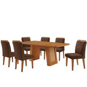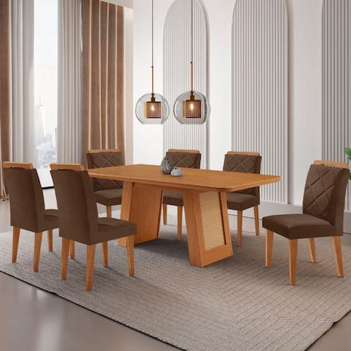 Mesa De Jantar Carolina Com 6 Cadeiras Moderna Mobilia Veludo Marrom/naturalle Laminado O conjunto formado pela Cadeira Melissa e a Mesa Carolina e a combinacao perfeita de sofisticacao, conforto e design contemporaneo. A Mesa Carolina, com tampo laminado de 180 cm, complementa o conjunto com estilo e praticidade. Seu diferencial esta na base com detalhes que imitam rattan, adicionando um toque natural e elegante ao ambiente.