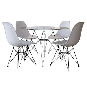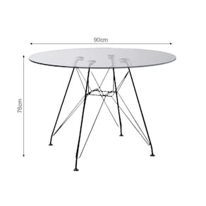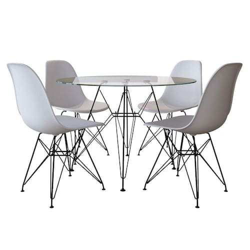 Mesa De Jantar Com 4 Cadeiras Brancas Eames Eiffel Tampo Vidro Redondo 90cm Base De Ferro PretoO Jogo de Mesa e Cadeiras Eames Eiffel se destaca pelo design moderno e sofisticado. A Cadeira Eames Eiffel é confeccionada em polipropileno, sua base é em ferro, o que confere total resistência e conforto. O Jogo de Mesa e Cadeiras Eames Eiffel da vida ao ambiente além de combinar com todos os tipos e cores de móveis.CARACTERISTICASTipo: ConjuntoModelo: Eiffel RedondoFerro: PretoDIMENSÕES DO PRODUTOCadeiraCor: BrancoAltura: 85cmLargura: 47cmProfundidade: 50cmAssento x Chão: 45cmMesa:Cor: VidroAltura: 76cmDiâmetro: 90cmObs: Imagens Meramente IlustrativaMesa de Jantar com 4 Cadeiras Brancas Eames Eiffel Tampo Vidro Redondo 90cm Base de Ferro Preto