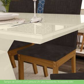 Ficha Tecnica: Escala de Brilho do Tampo: Brilhante Escala de Brilho da Base: Fosco Cor Predominante: Branco Acabamento da Base: Pintura UV Texturizada Acabamento do Tampo: Pintura UV Estilo: Moderno Suporta ate -Kg-: 40 Kg Material Principal: MDP Material do Tampo: MDF Material da Base: MDP Tampo com Vidro: Sim Vidro Temperado: Nao Tamanho do Vidro -L x C x E-: 80 cm x 160 cm x 4 mm Formato do Tampo: Retangular Mesa Extensivel: Nao Ideal para quantas cadeiras: Mesa ideal para 04 ou 06 cadeiras.