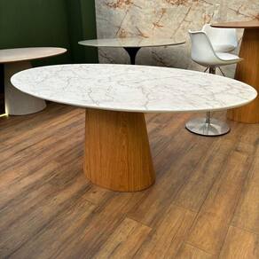 Base: Feita de madeira freijó, conhecida por sua durabilidade e tonalidade quente, que adiciona um toque acolhedor e natural ao ambiente. A estrutura é robusta, proporcionando estabilidade à mesa e criando um contraste harmonioso com o tampo.