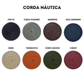 Estrutura da base em Fiberboard com acabamento em Corda Náutica. Tampo de 110 cm em MDF Laqueada com vidro serigrafado fixo, e contra tampo em MDF 18 mm.