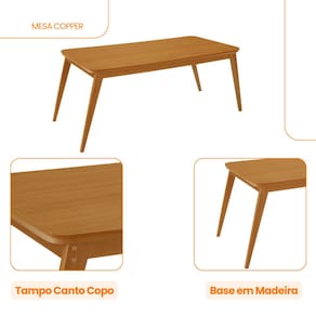 A mesa Copper, com base em madeira e tampo em MDF, irradia elegância e sofisticação. Seu design refinado, aliado a uma estrutura sólida. Perfeita para espaços que buscam aliar, estilo e conforto, essa mesa é a escolha ideal para transformar seu ambiente com classe e personalidade.