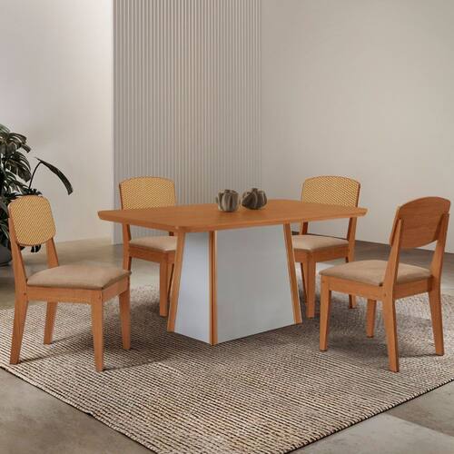 A Mesa Diane, produzida em 100 MDF com tampo canto copo, é a escolha ideal para transformar refeições em experiências memoráveis. Seu design elegante combina perfeitamente estilo e resistência, garantindo durabilidade sem abrir mão da estética. A base robusta, com extremidades em acabamento Naturalle, é um verdadeiro destaque visual, agregando charme e sofisticação ao ambiente. A Cadeira Copper Premium combina design contemporâneo e conforto, com encosto em MDF moldado que proporciona suporte ergonômico ideal. Seu estofado macio garante um assento aconchegante, enquanto o acabamento refinado e os detalhes sofisticados no encosto, que imitam rattan, valorizam seu visual, tornando-a perfeita para ambientes modernos e elegantes.