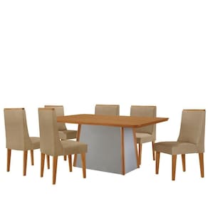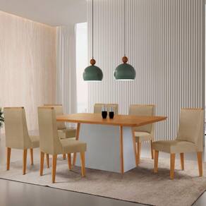 A Mesa Diane, produzida em 100 MDF com Tampo Canto Copo, e a escolha ideal para transformar refeicoes em experiencias memoraveis. Seu design elegante combina perfeitamente estilo e resistencia, garantindo durabilidade sem abrir mao da estetica. A base robusta, com extremidades em acabamento Naturalle, e um verdadeiro destaque visual, agregando charme e sofisticacao ao ambiente. As Cadeiras Lisboa completam o conjunto com conforto e praticidade. Totalmente estofadas, proporcionam uma experiencia agradavel ao sentar, enquanto suas alcas facilitam o manuseio no dia a dia, tornando o ambiente ainda mais funcional.