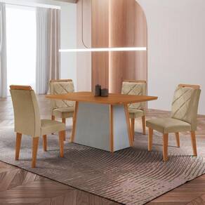 Mesa De Jantar Diane E 4 Cadeiras Melissa Moderna Mobilia Turim 07/ Laminado A Mesa Diane e uma peca robusta e imponente, projetada para transformar qualquer ambiente. Com tampo em MDF e acabamento canto copo, ela oferece um visual sofisticado e moderno. Sua base se destaca pelos detalhes nas extremidades em acabamento Naturalle, criando um contraste elegante que valoriza ainda mais o design. Ideal para complementar e destacar sua sala de jantar com personalidade.